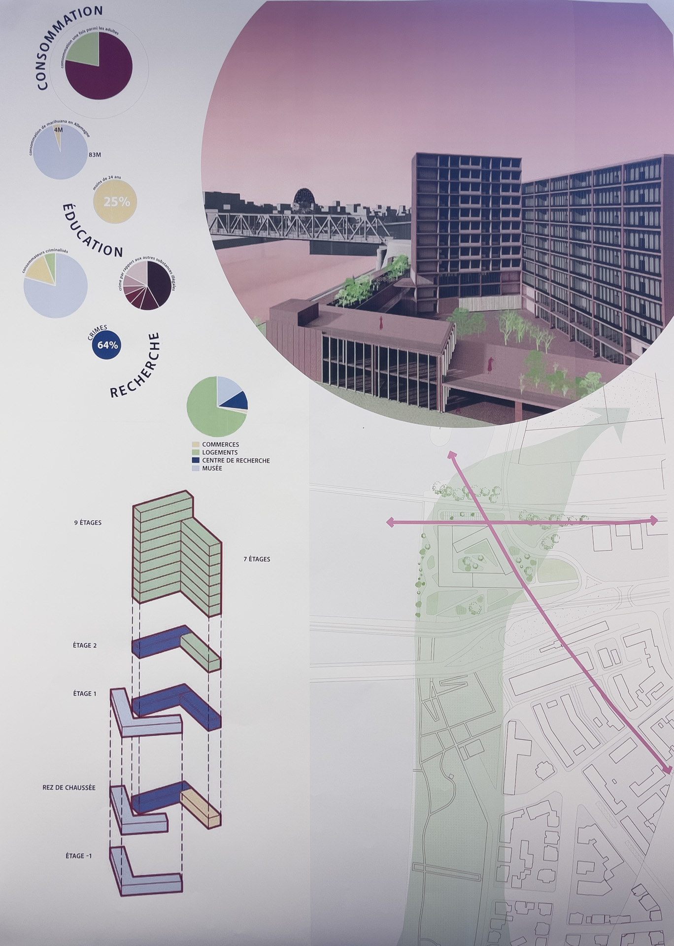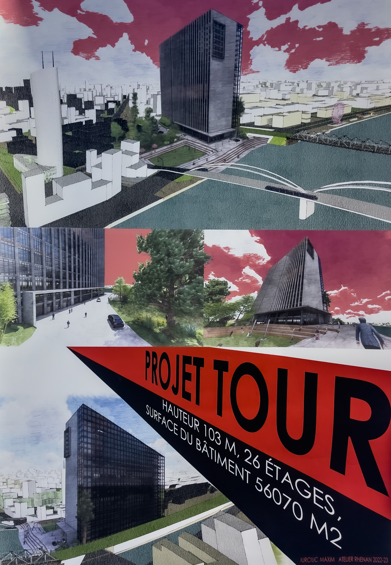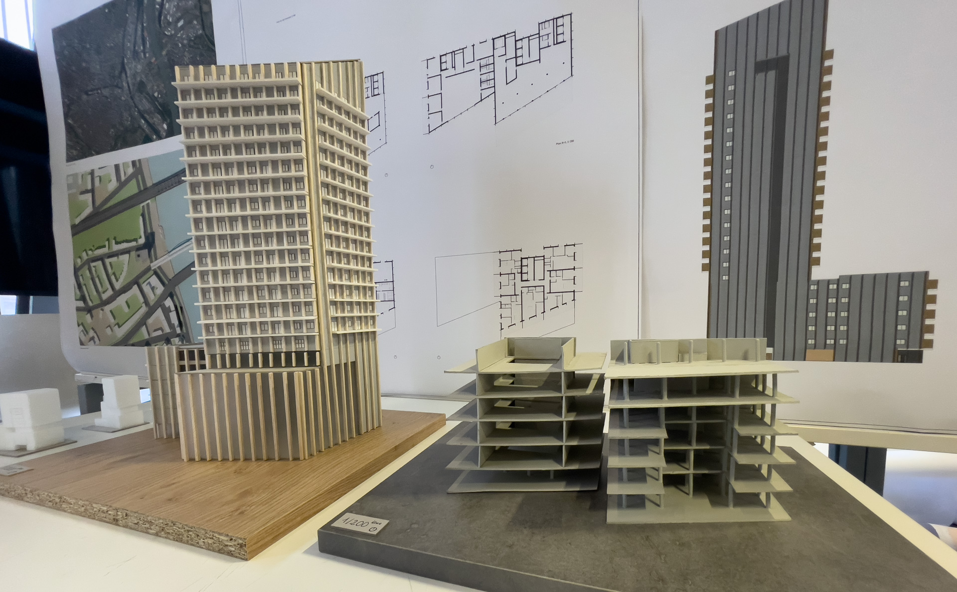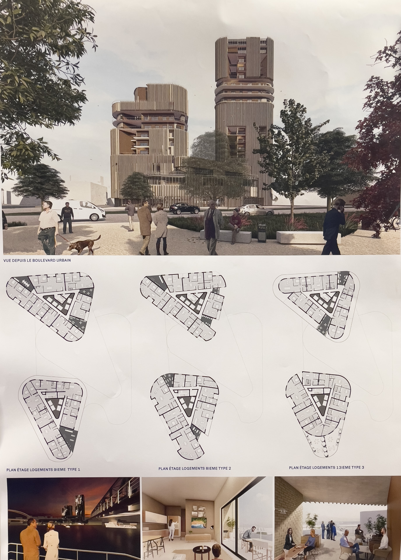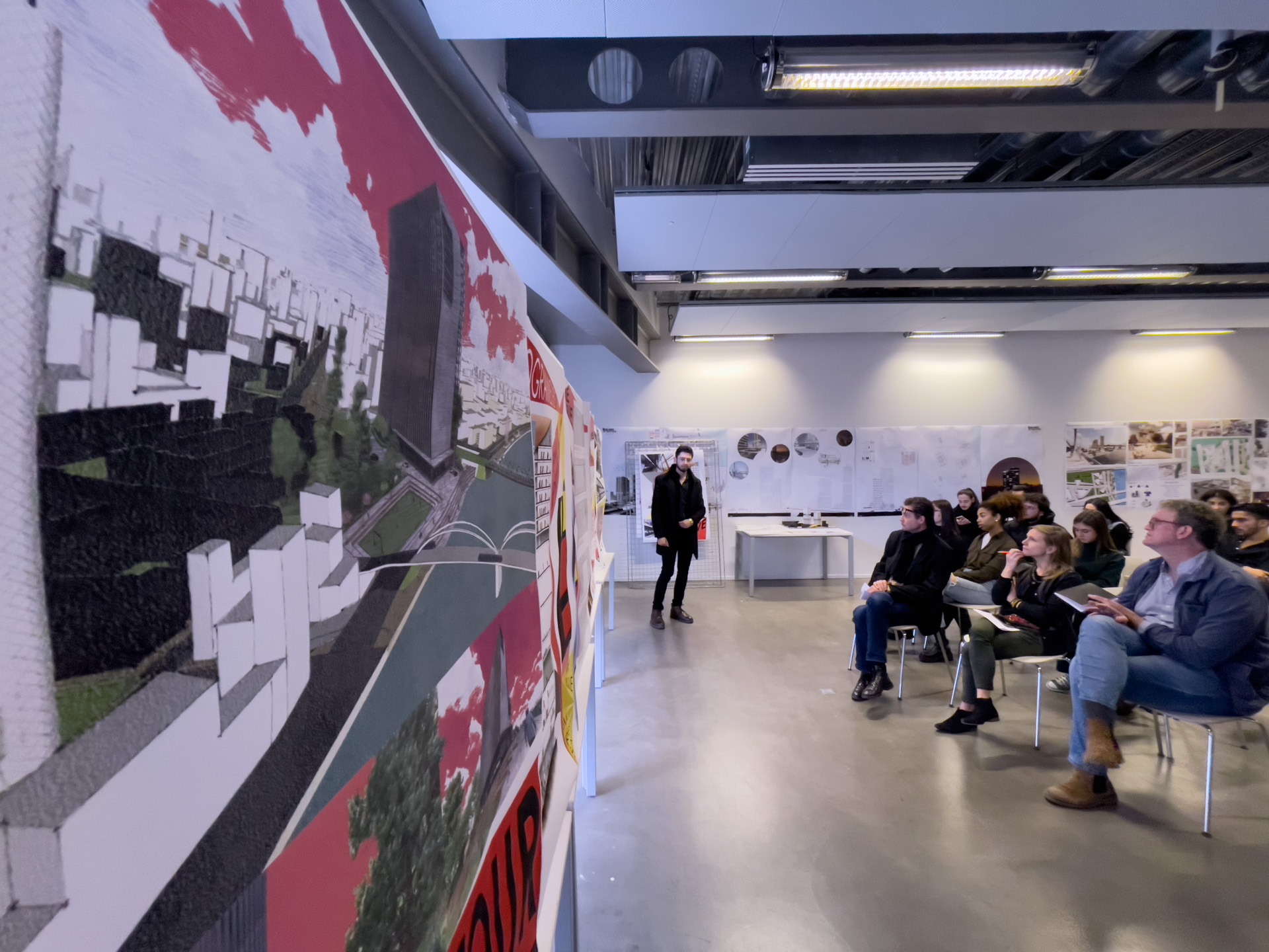 Quelques vues non exhaustives des rendus de Master, dans l’atelier Rhénan. Les projets s’intéressent au face à face Strasbourg-Kehl enfin relancé par l’arrivée du Tram, et territoire expérimental pour de prochaines grandes transformations urbaines à venir.