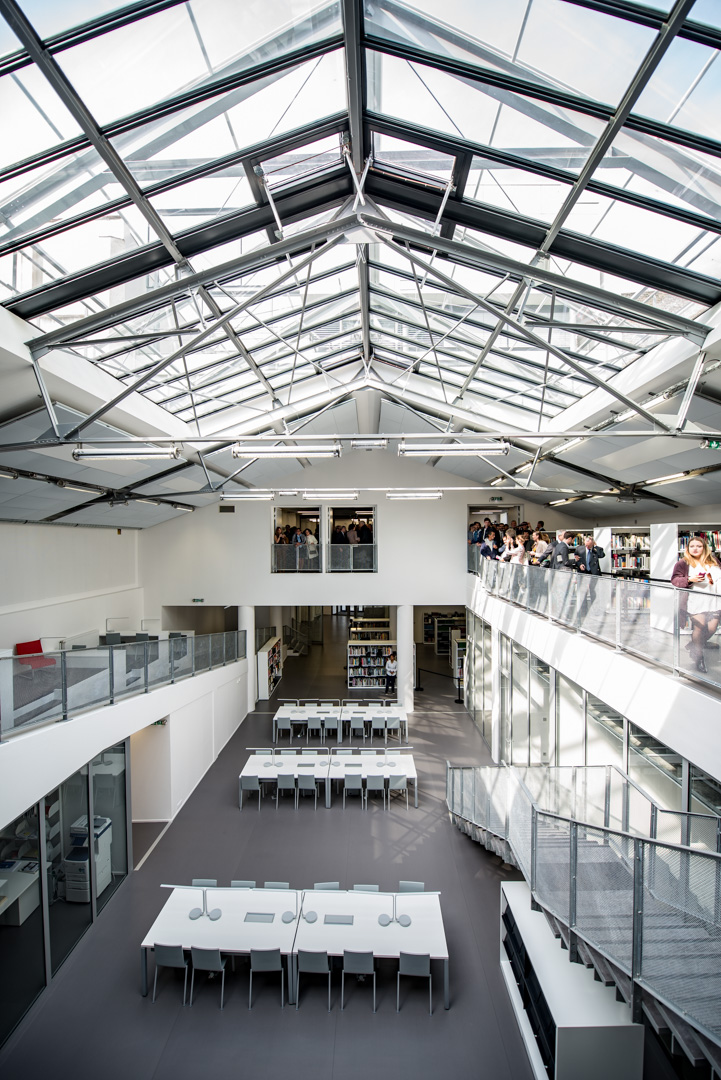 La bibliothèque offre une centaine de places de travail ainsi que 4 salles de travail en groupe réservables (une salle est réservée aux enseignants et chercheurs). La bibliothèque est équipée de postes de consultation, d’un scanner et du WIFI.