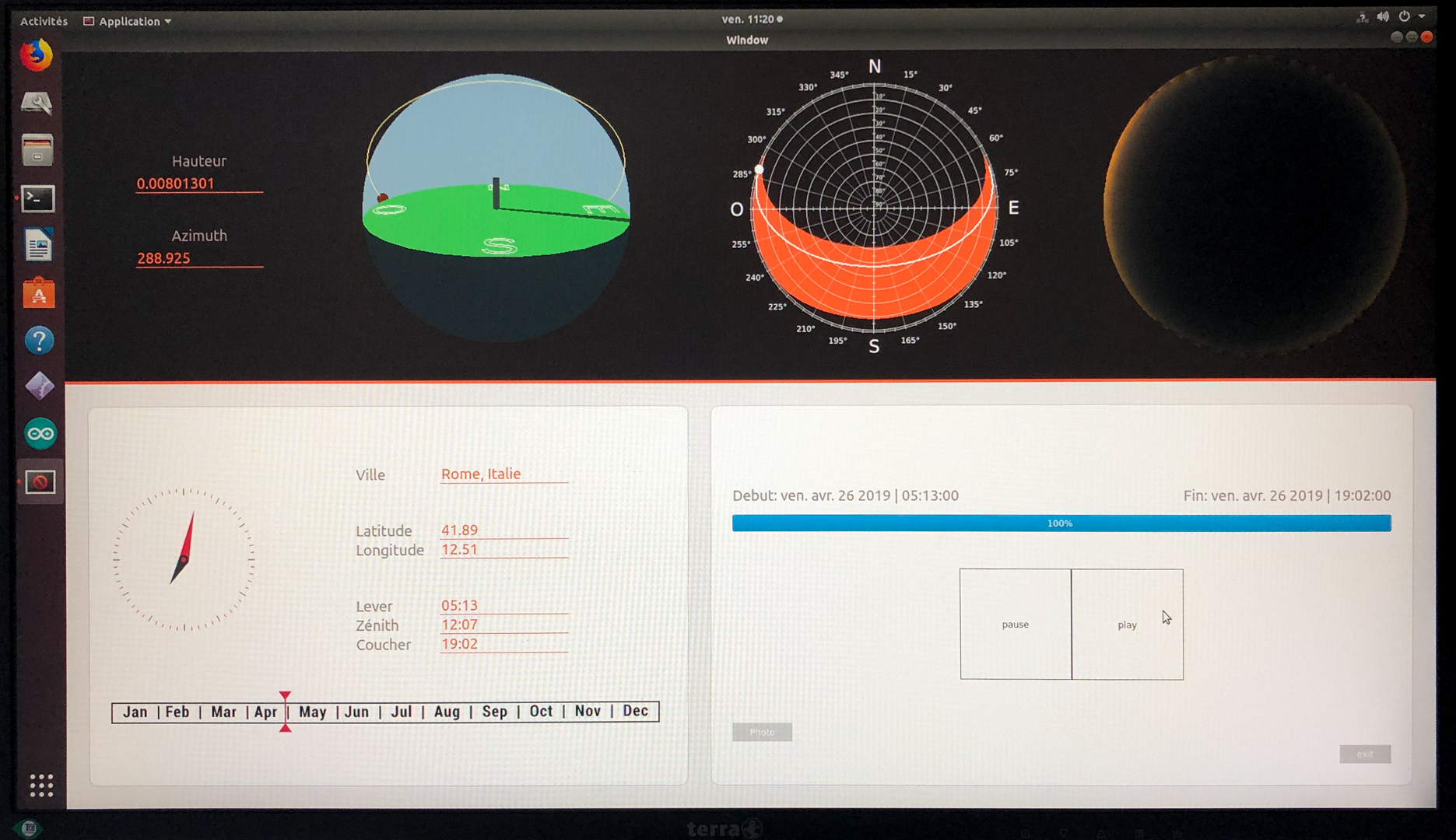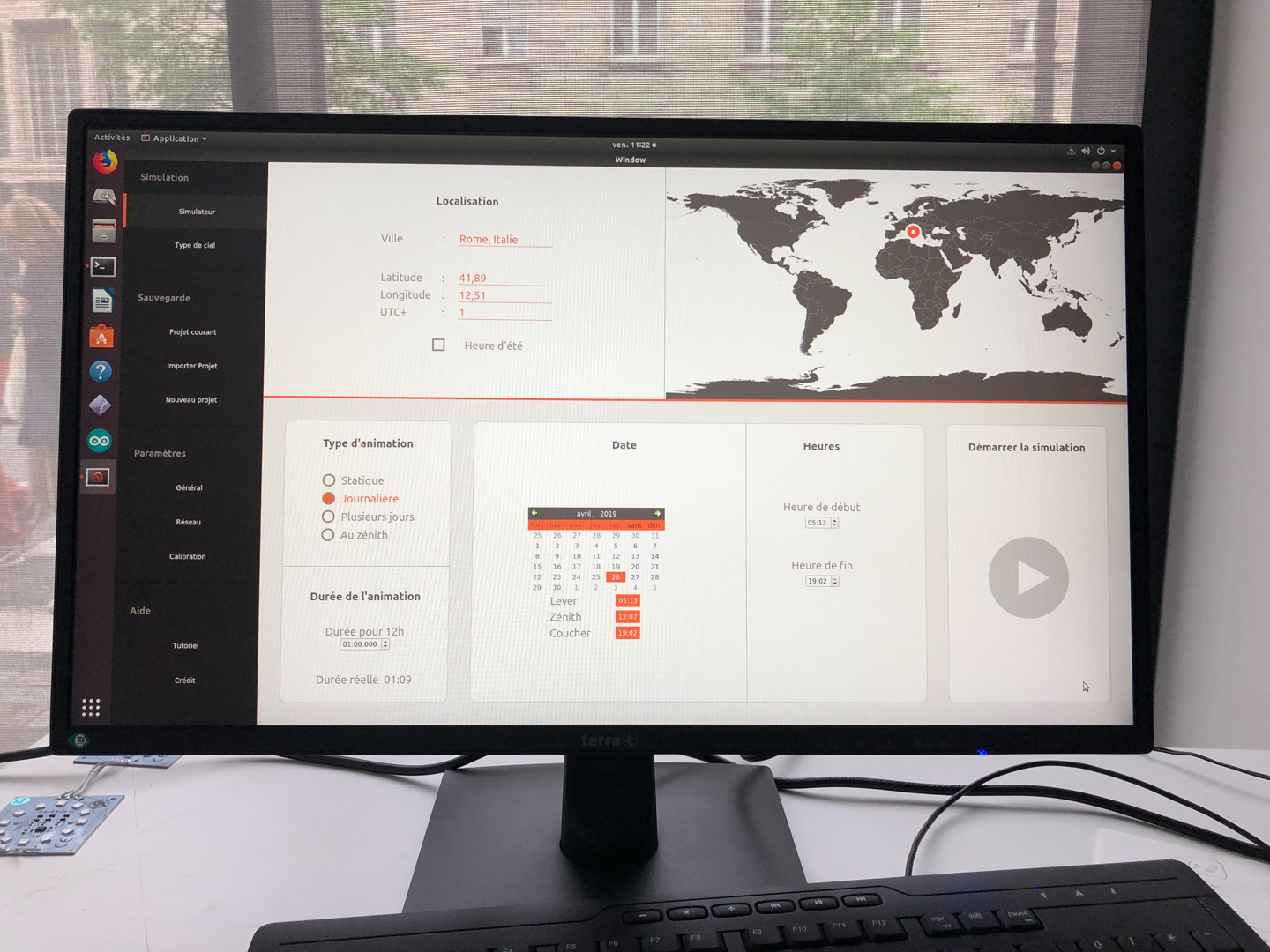 L’utilisateur définit la position géographique, le jour, le modèle de ciel, ainsi que la durée de la simulation. Une fois la situation validée, le soleil mécanique se met en position et la simulation démarre. Le logiciel affiche une nouvelle fenêtre qui montre le diagramme solaire et l’évolution de la couleur du ciel en fonction du modèle implémenté.