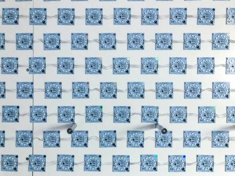 Dans un cube d’expérimentation, un plafond lumineux est entouré de murs entièrement couverts de miroirs. Dans cet équipement, des rubans LEDs monochromatiques (Tc= 5 000K) sont collés sur le plafond. Comme dans l’autre simulateur, un diffuseur en polycarbonate assure une répartition homogène de la lumière.