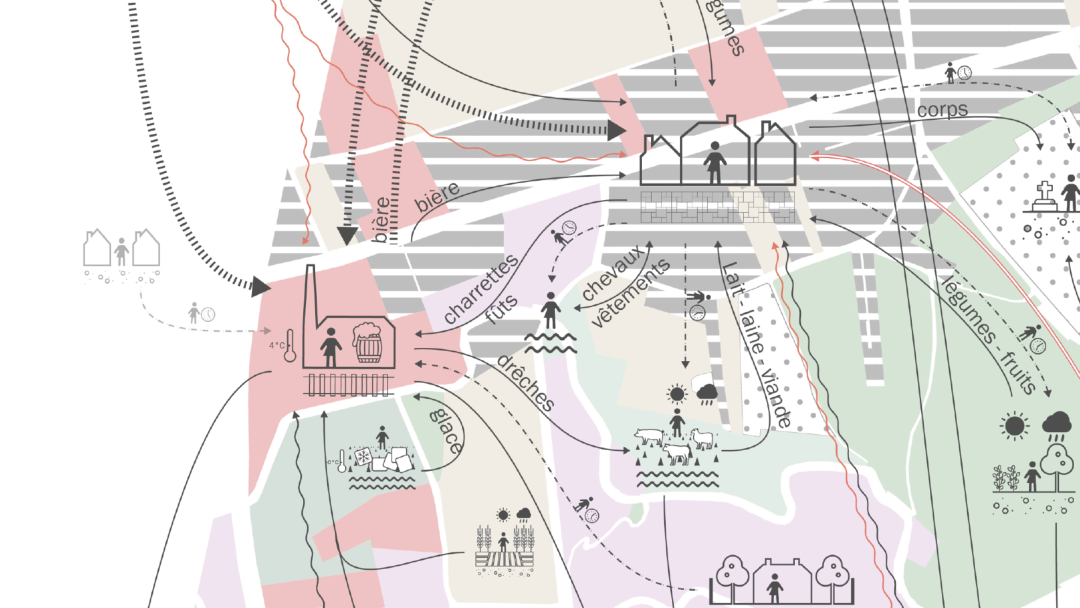 Nous explorons cette question à partir d’un territoire urbain singulier, le quartier Koenigshoffen-Est à Strasbourg. Inspirée des méthodes ascendantes de l’analyse de flux de matière (MFA), la formation d’un modèle spatial d’appréhension du métabolisme autorise la captation conjointe de deux dimensions apparaissant comme caractéristiques de l’urbanisation moderne : la fragmentation territoriale et l’éloignement spatial des flux de production. Par le biais du modèle, nous construisons une lecture matérielle, historique et multisituée du quartier et de ses évolutions récentes (1828-2023), dans le but d’en extraire des leviers de transformation territoriale.
